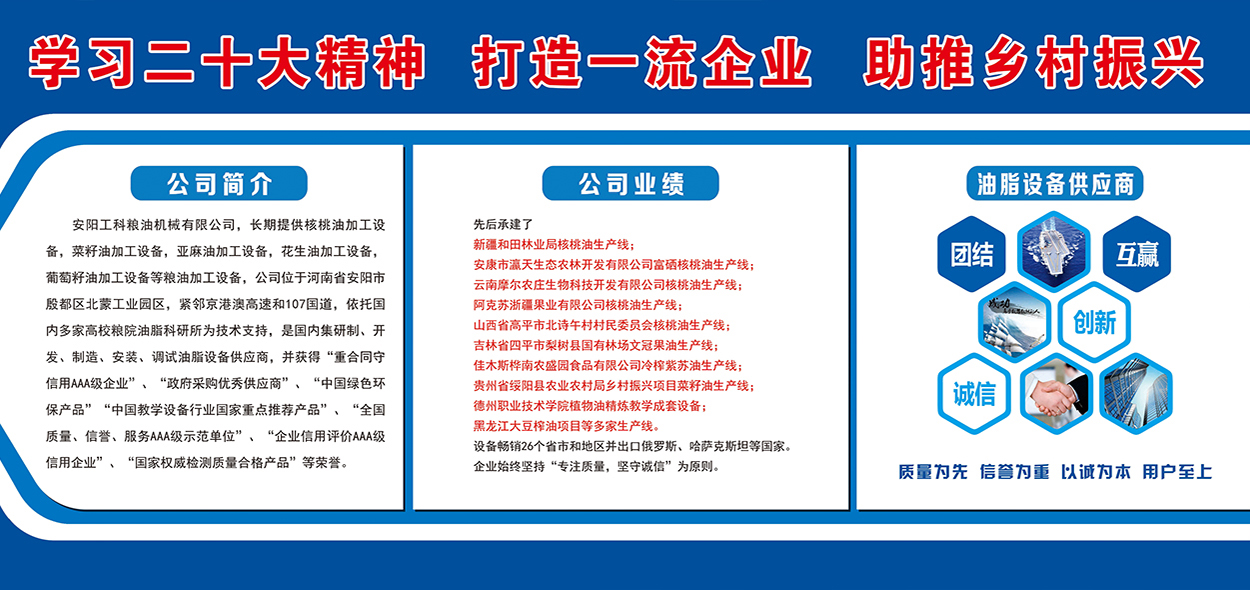 安陽工科糧油機械有限公司,長期提供核桃油加工設(shè)備,茶籽油加工設(shè)備,菜籽油加工設(shè)備,亞麻油加工設(shè)備,花生油加工設(shè)備,葡萄籽油加工設(shè)備等糧油加工設(shè)備,公司位于河南省安陽市殷都區(qū)北蒙工業(yè)園區(qū),緊鄰京港澳高速和107國道,依托國內(nèi)多家高校糧院油脂科研所為技術(shù)支持,是國內(nèi)集研制、開發(fā)、制造、安裝、調(diào)試油脂設(shè)備供應(yīng)商,并獲得“重合同守信用AAA級企業(yè)”、“政府采購優(yōu)秀供應(yīng)商”、“中國綠色環(huán)保產(chǎn)品”“中國教學設(shè)備行業(yè)國家重點推薦產(chǎn)品”、“全國質(zhì)量、信譽、服務(wù)AAA級示范單位”、“企業(yè)信用評價AAA級信用企業(yè)”、“國家權(quán)威檢測質(zhì)量合格產(chǎn)品”等榮譽。先后承建了新疆和田林業(yè)...